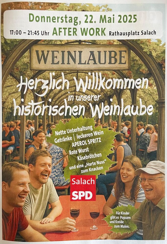 Wir freuen uns, zur Reihe der After Work-Parties der Salacher Vereine und Organisationen beitragen zu können. Am Donnerstag, dem 22. Mai ab 17 Uhr können Sie sich auf einen schwungvollen Vorabend freuen, der Kindern wie Erwachsenen Vergnügen und Geselligkeit bietet. Und ein Quiz ‚Wer kennt sich bei Salacher Wirtschaften gestern und heute aus?‘ wird für Salach-Experten einige harte Nüsse und natürlich Preise bereit halten. Freuen Sie sich heute schon auf ein stimmungsvolles Festle!